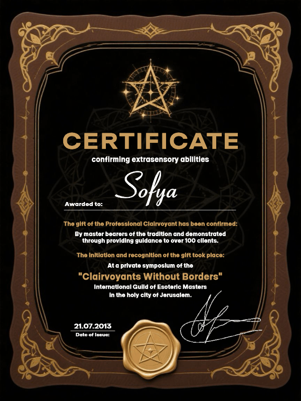 Я был поражён, как София увидела мою ситуацию без подсказок. Рассказала всё, что происходило в моей жизни последние годы. Я пришёл к ней из-за проблем в семье, и она помогла наладить отношения с женой. Мы стали общаться как раньше, без криков и обид. Я даже не ожидал такого результата. Теперь советую её друзьям!